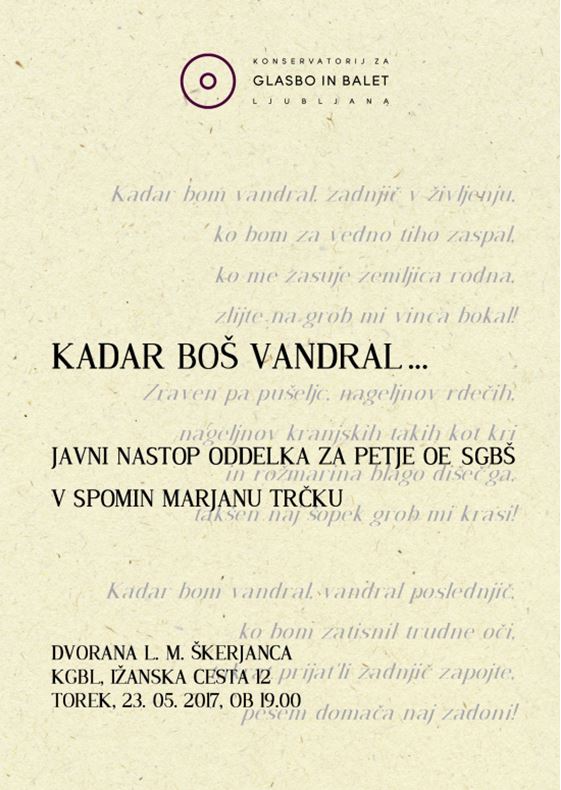 Javni nastop pevskega oddelka SGBŠ v spomin Marjanu Trčku, prof.