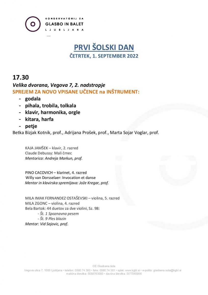 Ob 17.30 sprejem za učence prvih razredov za vse inštrumente in prvič vpisane učence, Velika dvorana, Vegova 7