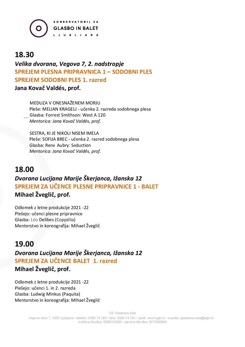 Ob 18.30 sprejem učencev pripravnic in učencev 1. razreda sodobnega plesa, Velika dvorana, Vegova 7