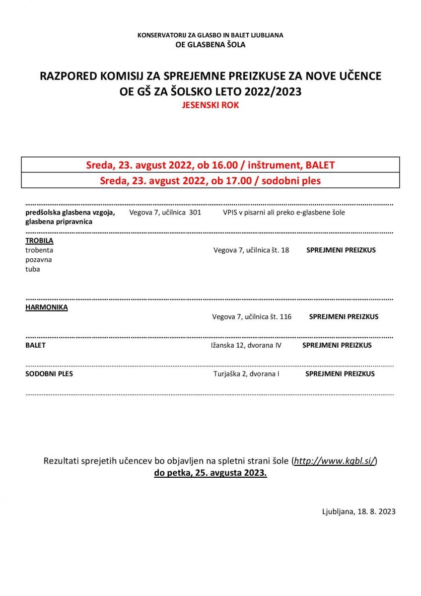 objavljeni so termini sprejemnih preizkusov za vpis v programe glasbene šole za šolsko leto 2023-24, Jesenski rok.